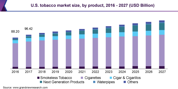 The global tobacco market size was valued at USD 849.09 billion in 2019 and is expected to grow at a compound annual growth rate (CAGR) of 3.1% from 2020 to 2027. The market is gaining momentum and witnessing a high demand owing to rising consumer disposable income, increasing number of product launches, and availability of superior-quality products. Increasing consumption of tobacco products among females and students is also fueling market growth. According to the American Lung Association, the use of tobacco products has increased from 28.2 percent to 31.2 percent among high school students from 2002 to 2019 in U.S.