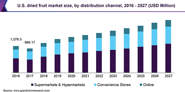 Shifting consumer preference for healthy and nutritious foods owing to rise in obesity and growing aging population are driving the market for dried fruit. Furthermore, increased acceptance for nutritious packaged food and wide application of dried fruit in the dairy, bakery, snack, and confectionery industries have fueled the demand for dried fruit over the years.